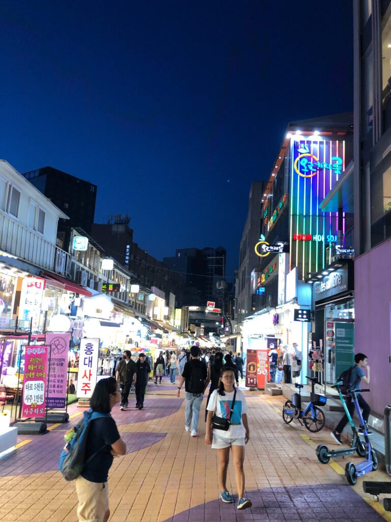 Quand la lumière tombe, prends le métro direction Hongdae. Ce quartier est un concentré d’énergie, entre musique live, street food fumante et spectacles improvisés. C’est ici que Séoul vibre le plus fort.