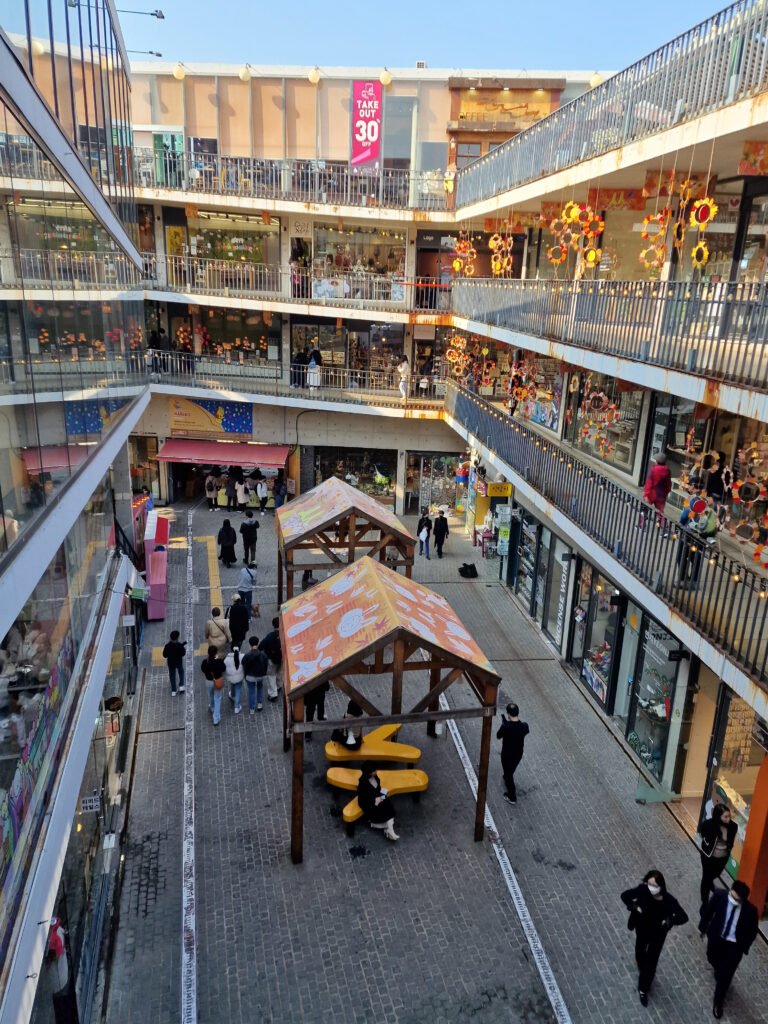 Descends ensuite vers Insadong, quartier arty-rétro idéal pour dénicher des souvenirs uniques. Ici, tu trouveras des calligraphies, des antiquités, des boutiques de souvenirs authentiques…et mon coup de cœur, le complexe Ssamziegil avec ses petites boutiques arty et colorées. Si tu veux faire une pause, les salons de thé ne manquent pas, tout comme l’étonnant musée du kimchi (parfait en cas de pluie).